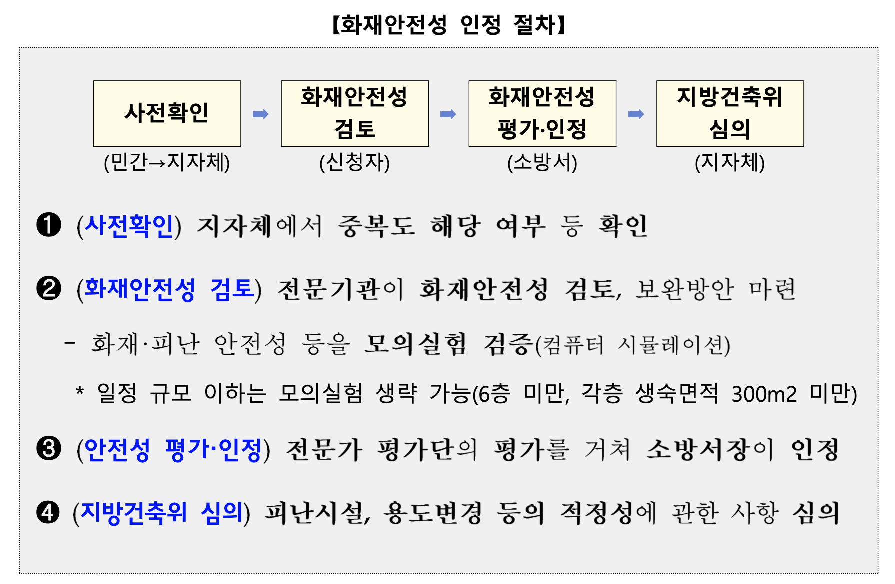 기존 복도폭이 1.8미터에서 1.5미터로 완화해주는 대신, 화재안정성 인정을 또 받아야 하고, 그거 받으려면 시뮬레이션을 해야하고, 또 건축심의까지 받아야 합니다. 하나의 법을 완화해주면 새로운 법이 5개 생깁니다. 산너머 산입니다. 건축행정 정말 복잡해지고 시간도 많이 걸립니다. 이럴려면 뭐하러 완화해줍니까?