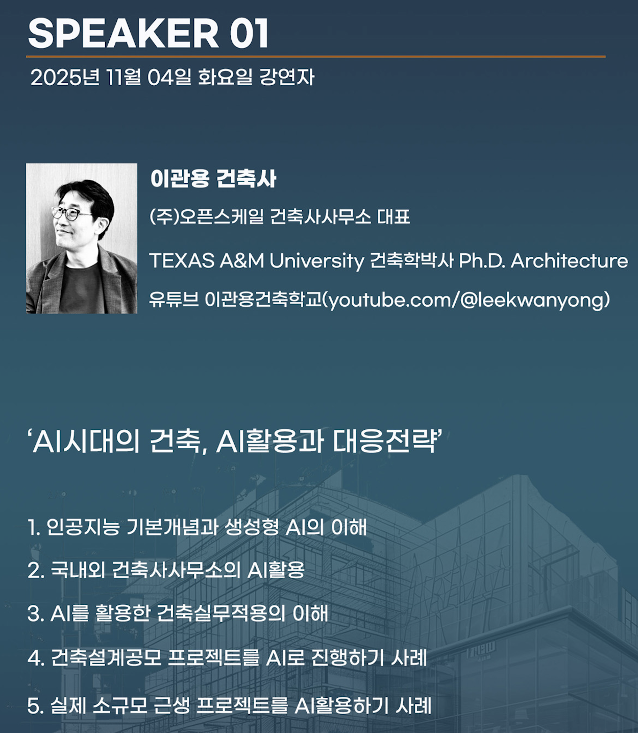 강사: 이관용건축사. 주제: AI시대의 건축, AI활용과 대응전략.